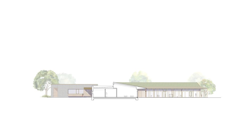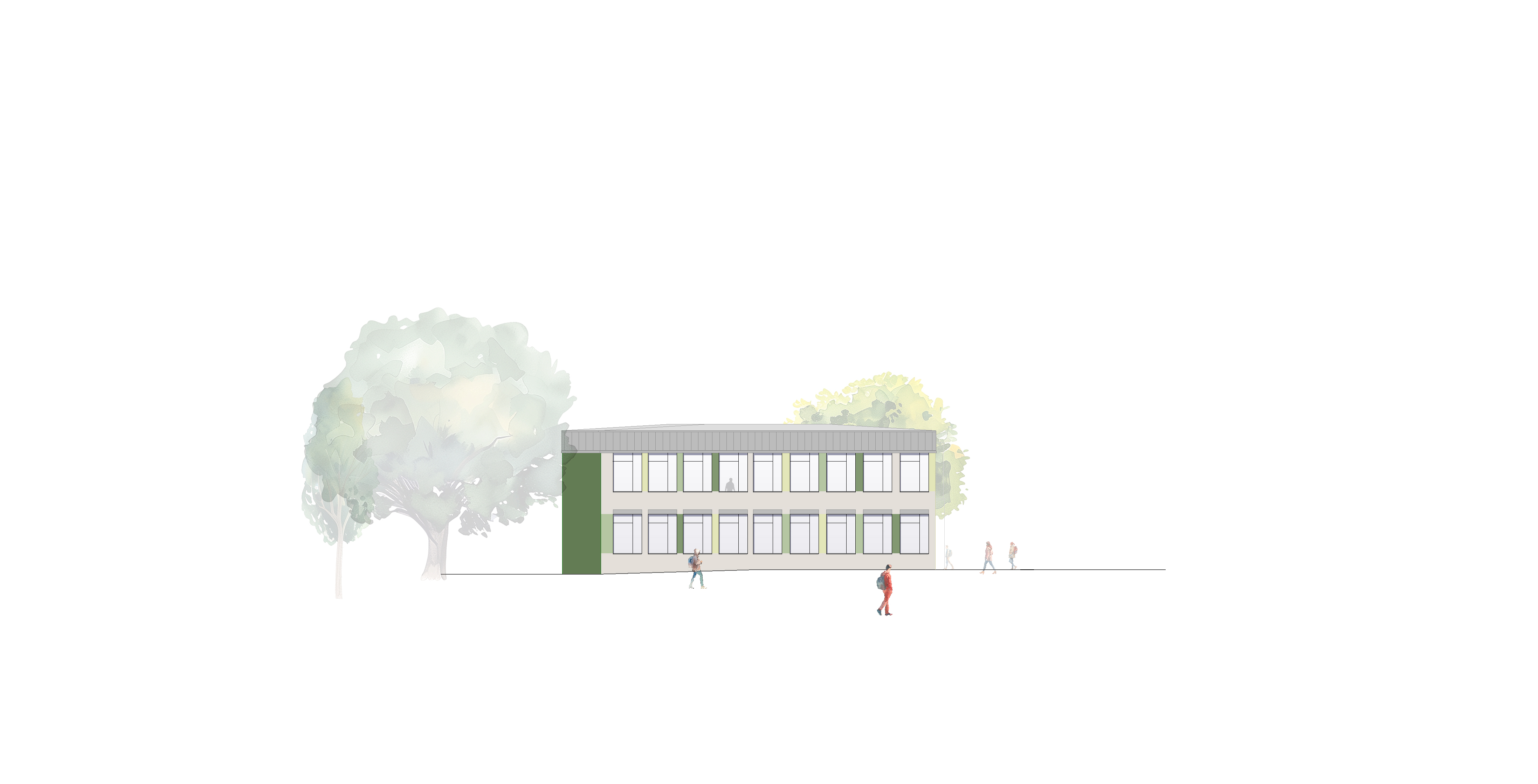 Entwurf für den Neubau eines Verwaltungsgebäudes in Holzbauweise. Der Baukörper nutzt das leicht abfallende Gelände für eine barrierefreie Eingangstreppe, welche den zentralen Empfang erreicht. Während das Erdgeschoss die dienenden Räume, eine Kantine und die Abteilungen mit Kundenverkehr beinhaltet, befinden sich interne Abteilungen und die Geschäftsführung in den Obergeschossen.
