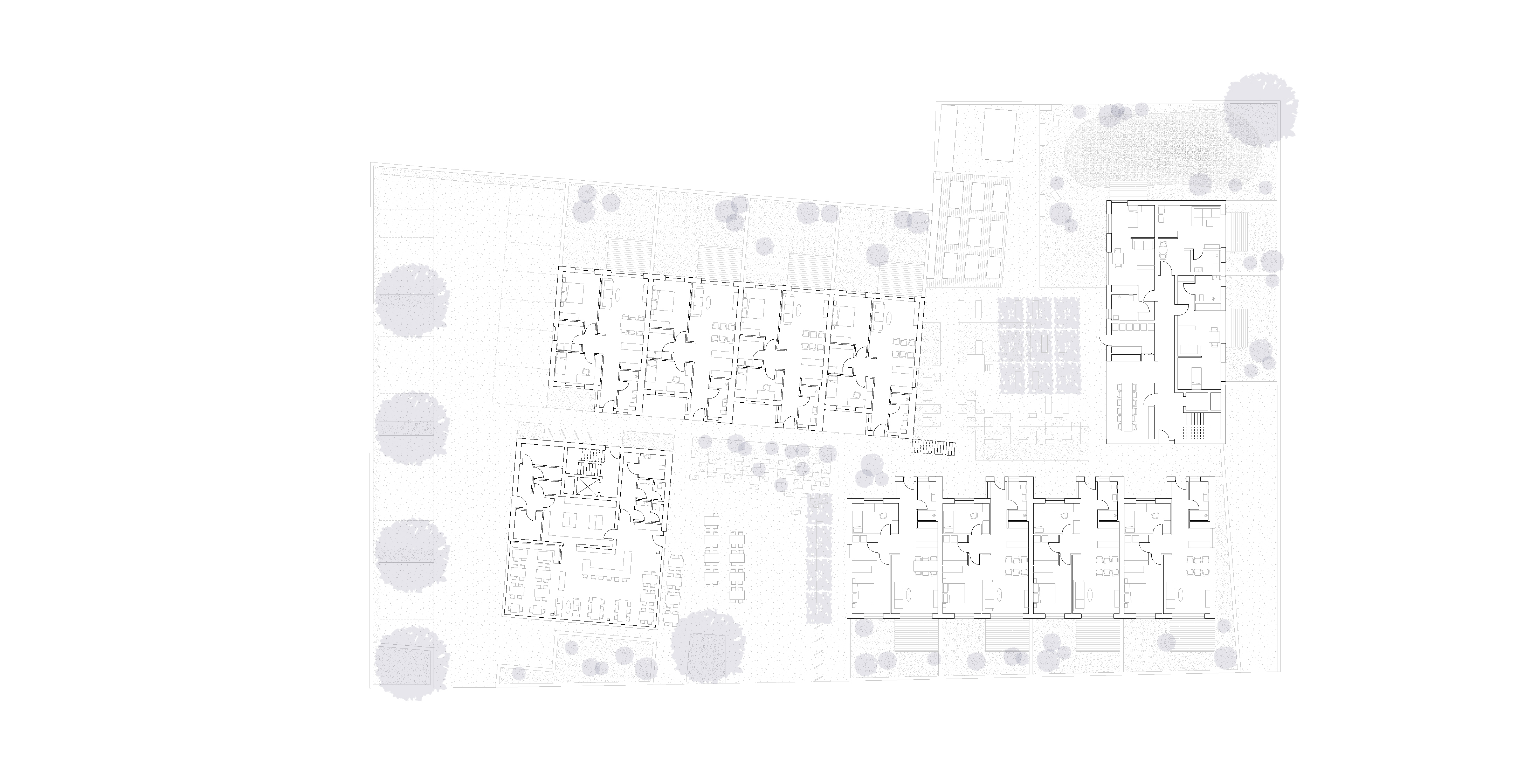 Neben einem Lückenschluss im Norden des Grundstückes wurde für den Innenbereich eine Gruppe aus drei dreigeschossigen Baukörpern entwickelt, die der erste Baustein einer größeren nachverdichtenden Stadtentwicklung des gesamten Quartieres darstellen sollten.