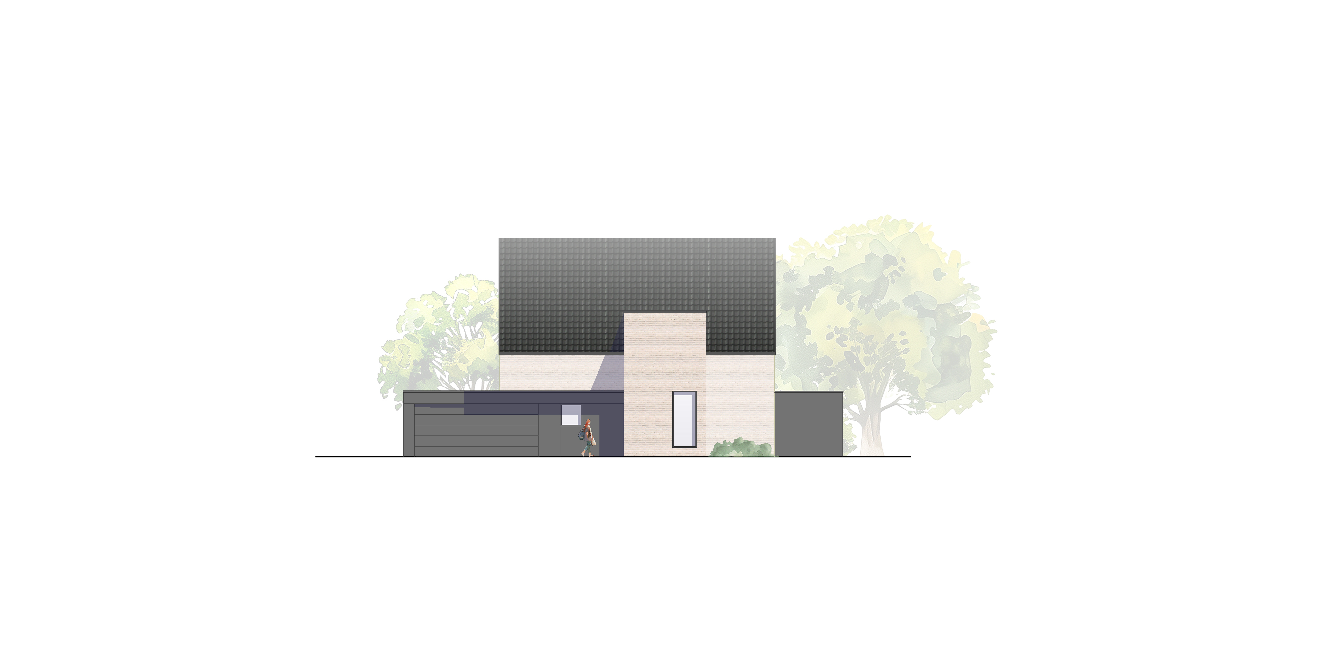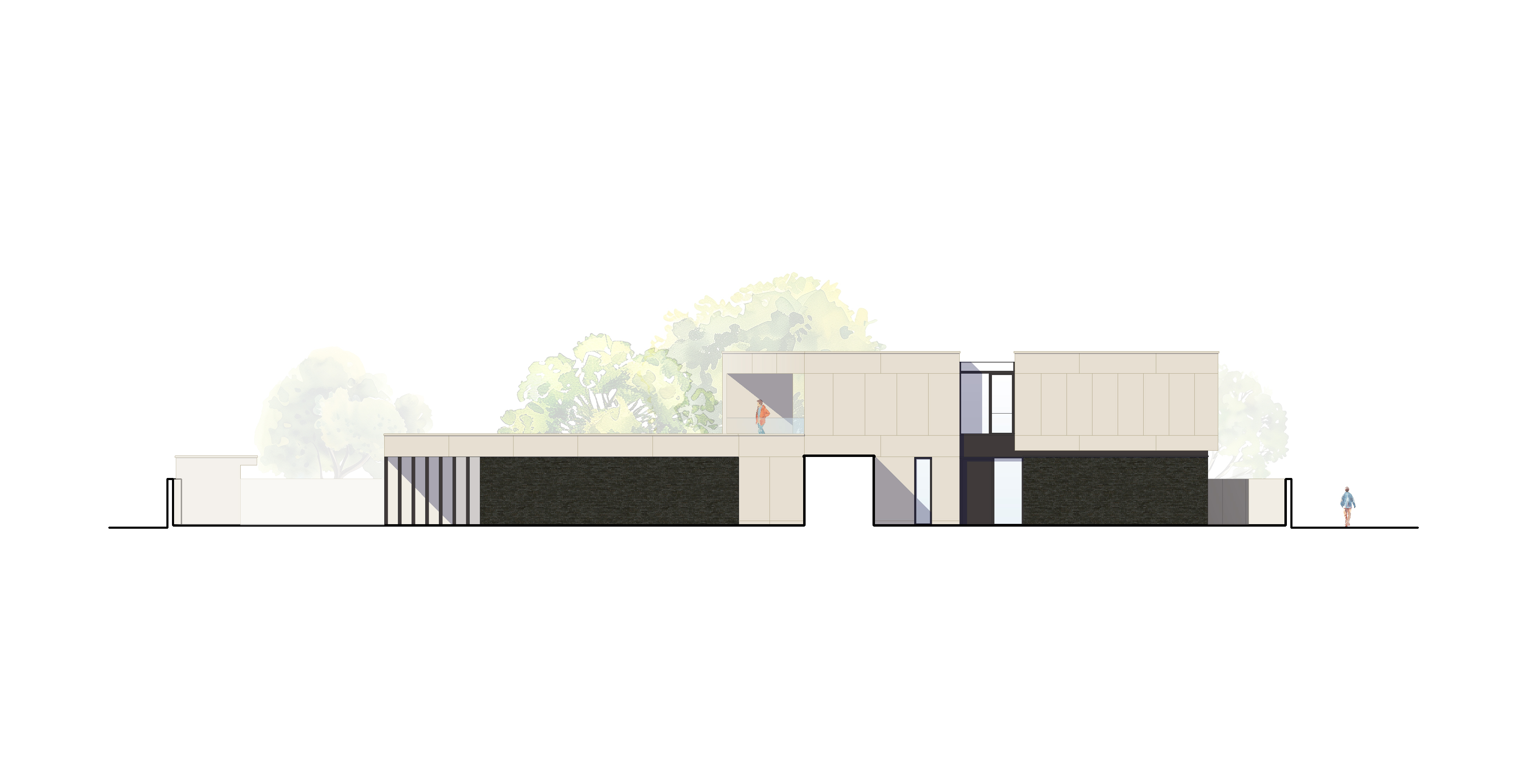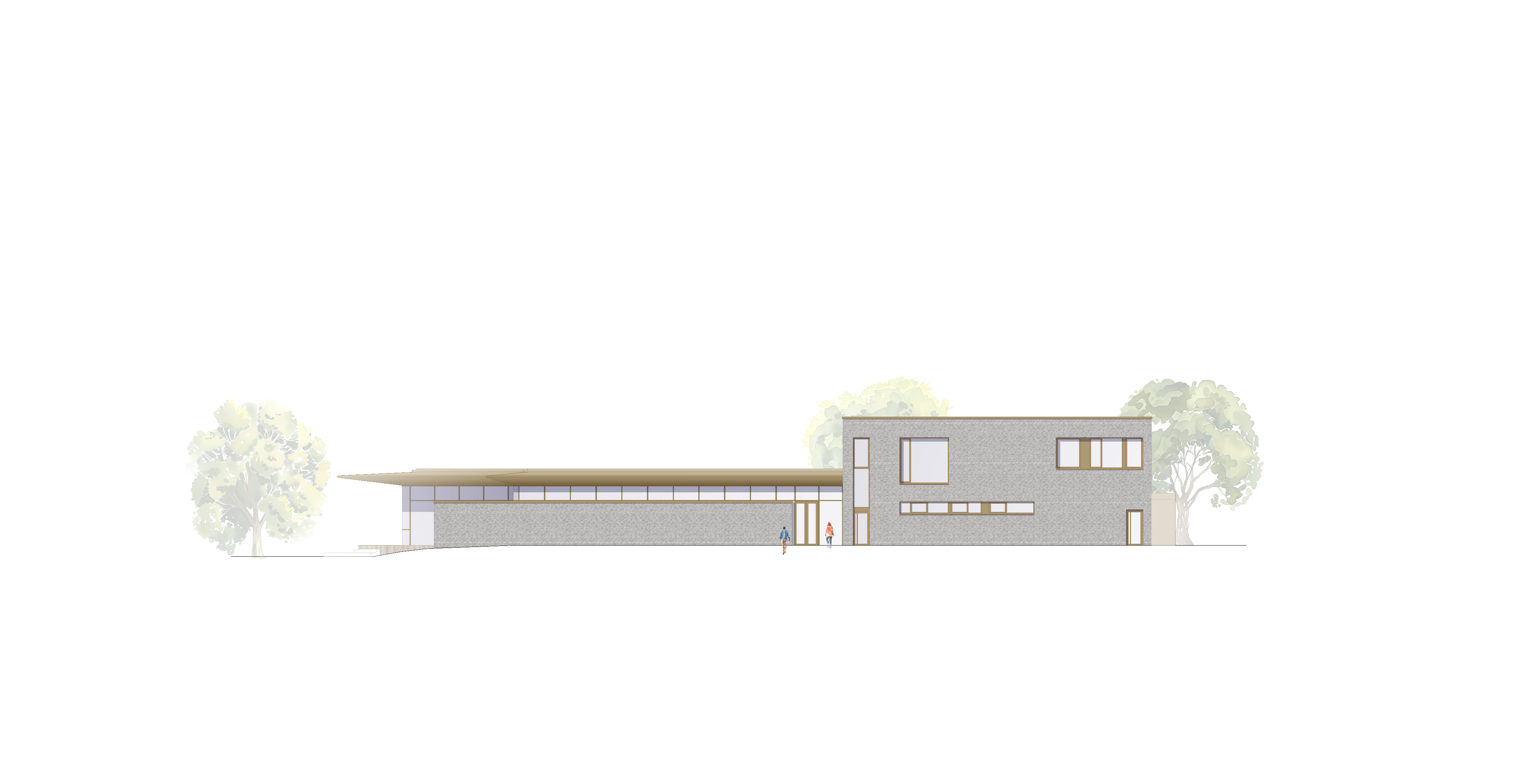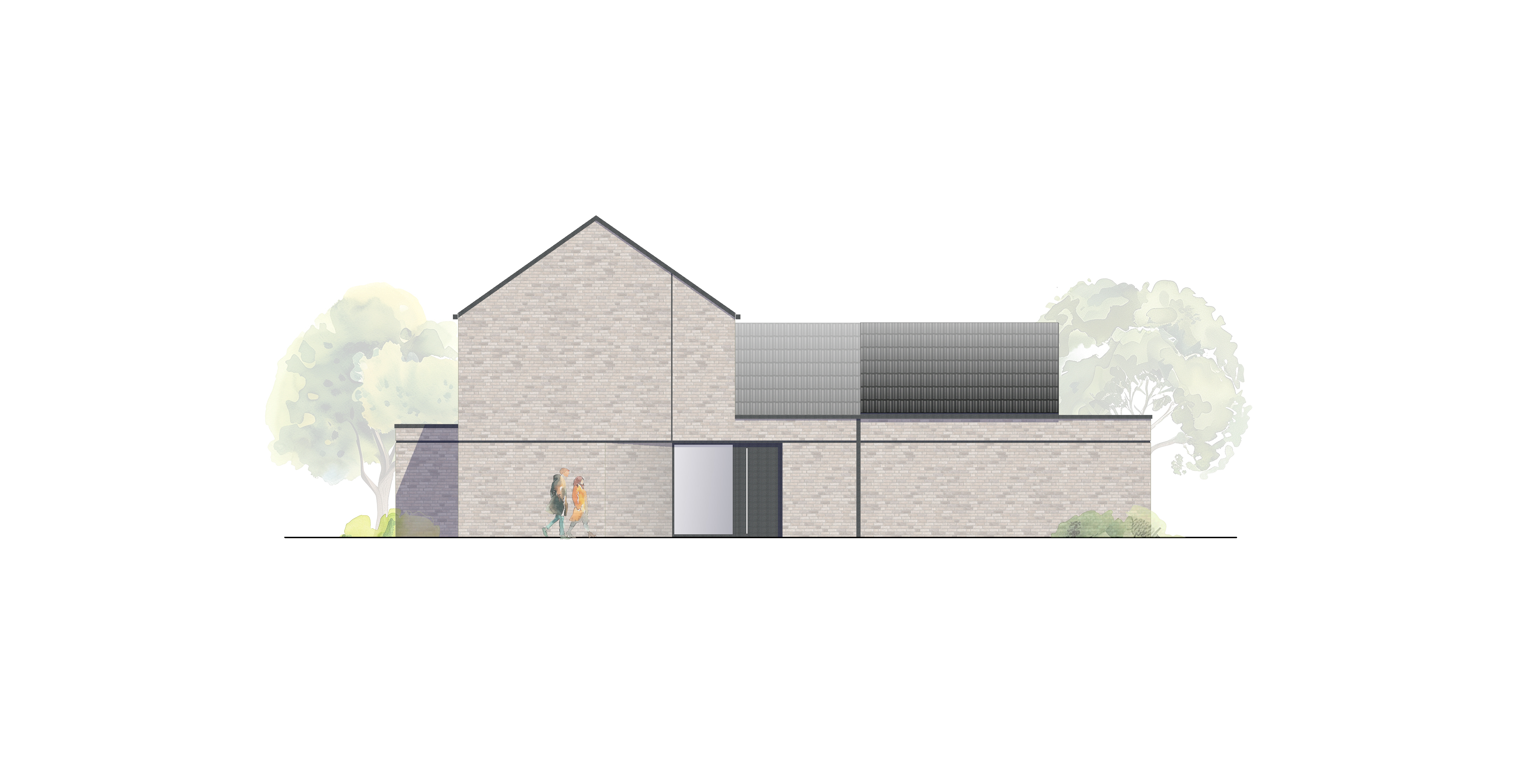 Statt die Architektursprache des Bestandsgebäudes nachzuahmen, setzen wir auf Kontraste: Die graue Holzvertäfelung über dem Haupteingang wird zum Anlass genommen, einen sehr schlichten Anbau zu entwickeln, welcher seine Ausdrucksstärke durch eine ausgesprochen minimalistische Detailausbildung erhält.