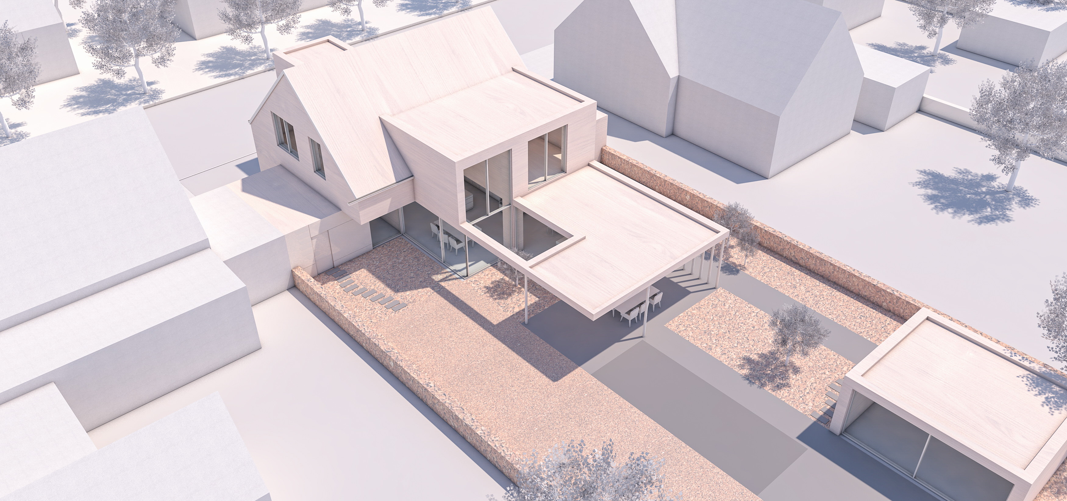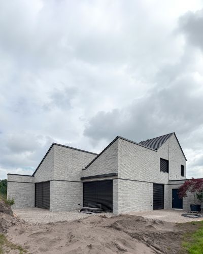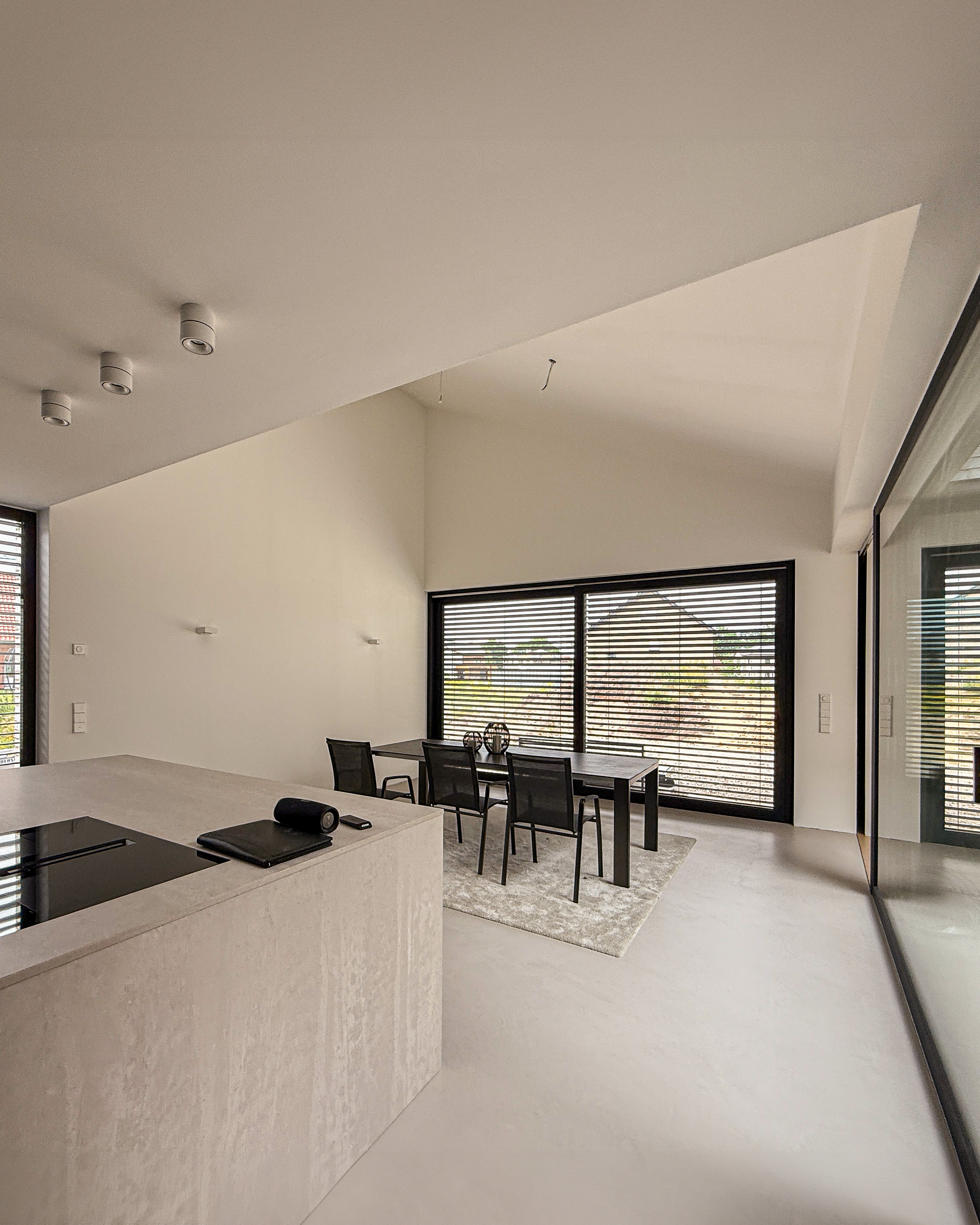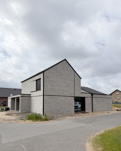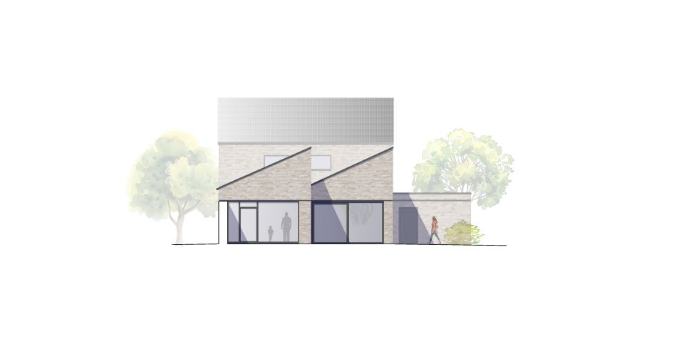 112 : Unweit des Projektes 108 an der Waldstraße in Lingen errichten wir ein Doppelhaus in monolithischer Bauweise. Während die Umgebung eine offene Bebauung vorgab, verlangte das kleinformatige, dreieckige Grundstück einen stark verdichteten Grundriss.