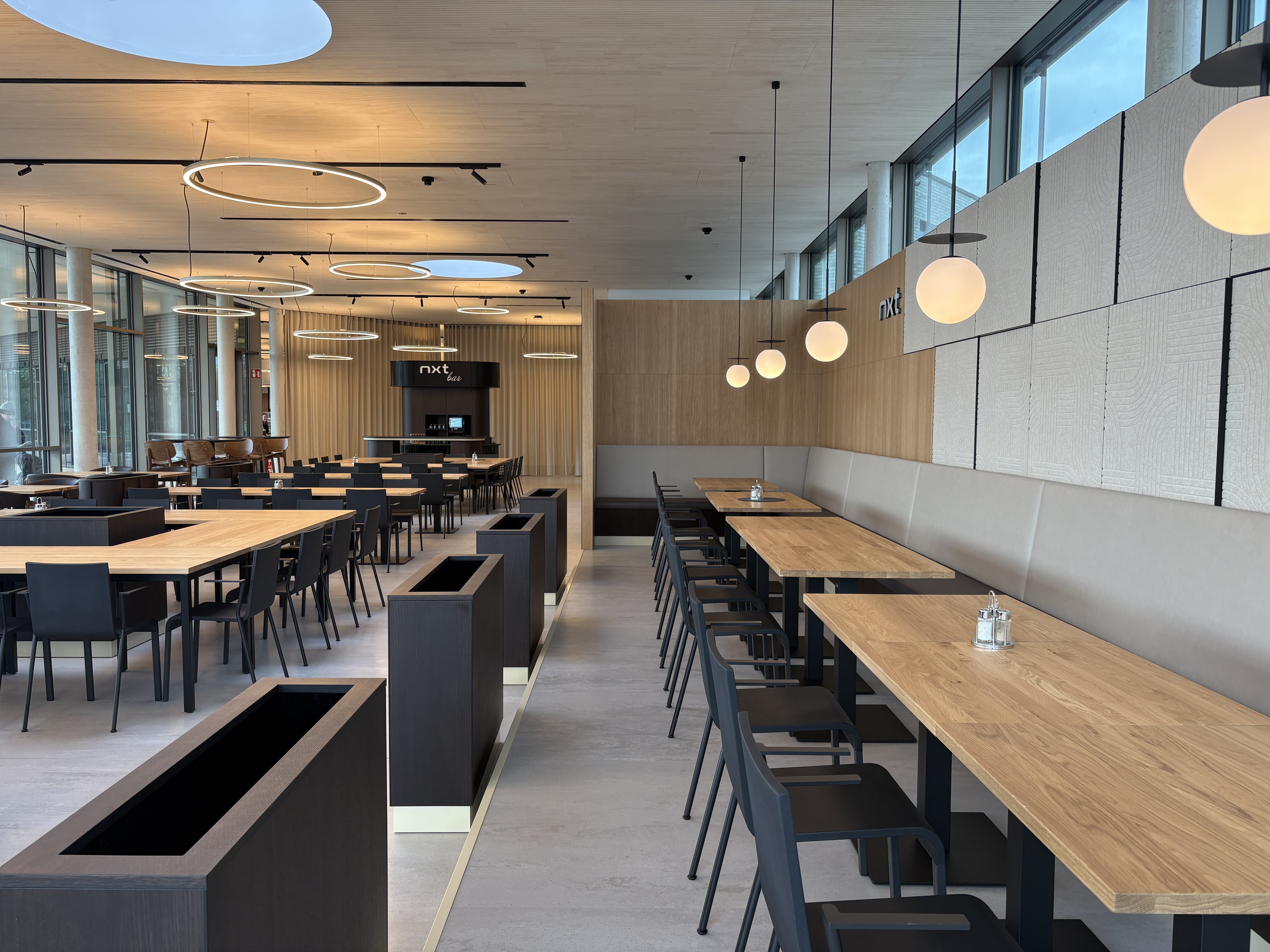 Der Speiseraum bietet über die vollflächige Glasfront einen Ausblick auf das auf dem Gelände gelegene Regenrückhaltebecken. Zudem haben die Mitarbeitenden die Möglichkeit ihre Pause direkt am Wasser auf der großzügigen Sonnenterrasse zu verbringen.