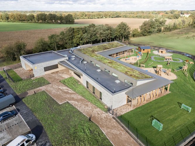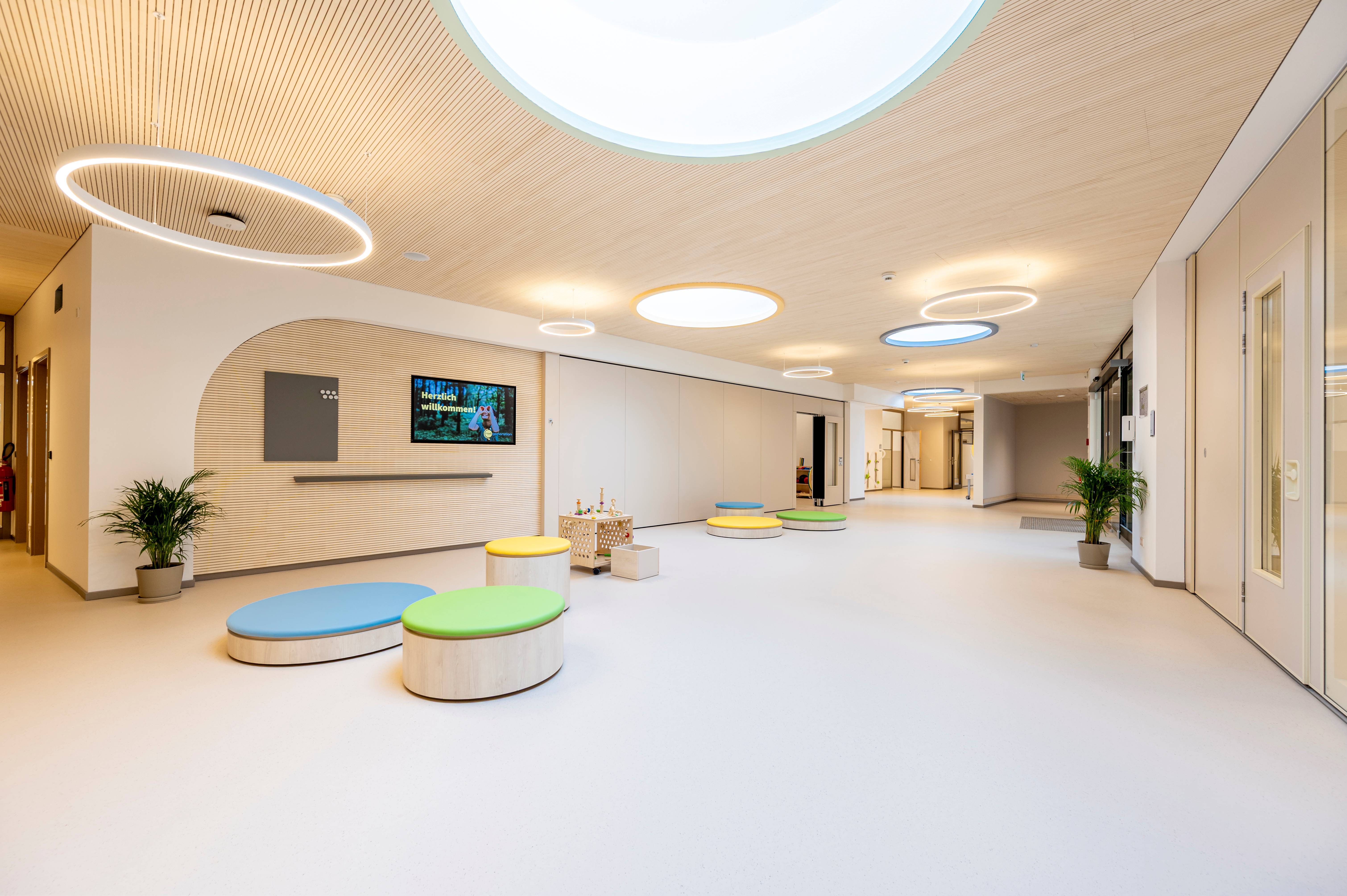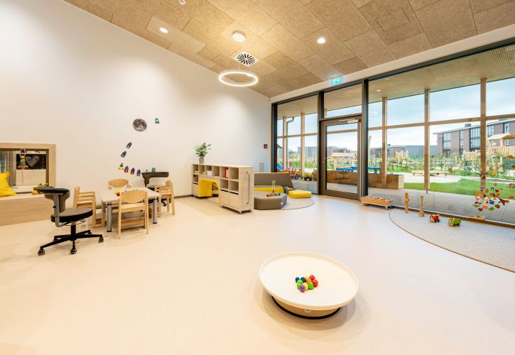 Die Aufgabe für den Entwurf war es eine natürliche, entspannte Umgebung für die frühkindliche Bildung zu schaffen. Entstanden sind vier Gruppen inkl. Zusatzräumen wie Speise-, Kreativ-, und Sinnesraum in betont dezentem Farbspektrum.