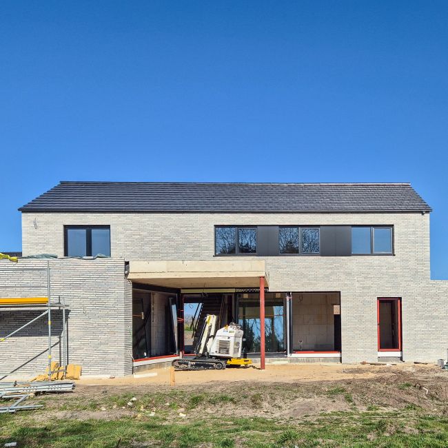 UPDATE: Auf Wunsch des Bauherren wurden diverse Teilflächen mit Klinkerriemchen beklebt. Die Verblender wurden bereits im Werk in nur ca. 2 cm Stärke gefertigt: Sie benötigen somit erheblich weniger Materiail und Enerige zur Herstellung, ergeben jedoch eine ebenso widerstandsfähige Oberfläche.