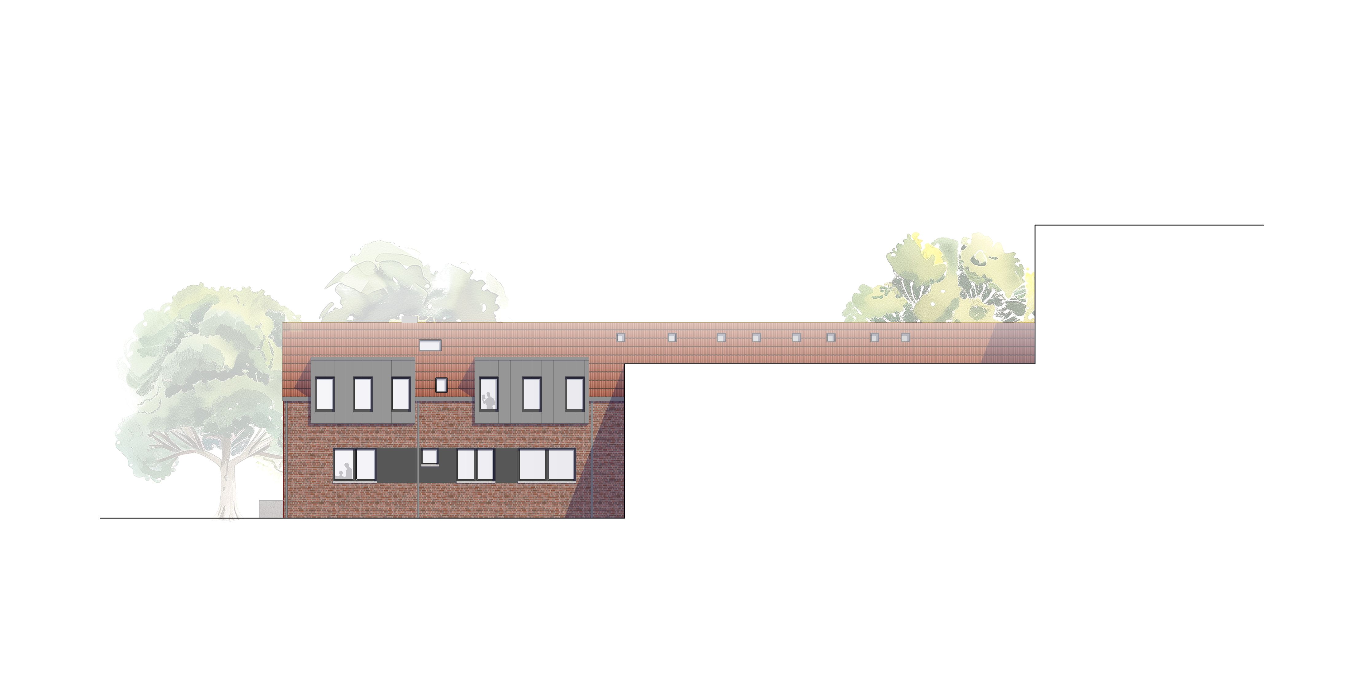 Unsere Antwort, welche wir als Unterstützer der Bau- und Projektplanung Exeler aus Lingen entwickeln durften, beinhaltet gewundene Wegeführungen vom Parkplatz zum Eingang, sehr reduzierte Ausblicke sowie warme, natürliche Materialien.